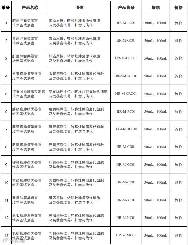 人源肿瘤类器官培养基为弘瑞医疗自主研发,针对中国多种高发性肿瘤原代细胞类器官体外培养开发的产品,目前已完成开发的肿瘤类器官培养基试剂盒有13种。