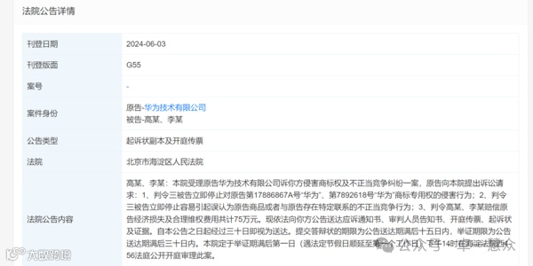 公告内容显示,华为公司指控高某、李某实施了侵害其“华为”商标专用权的行为,并进行了不正当竞争。华为公司请求法院判令两位被告立即停止侵权行为,同时停止任何可能引起消费者误认为其商品与华为存在特定联系的行为。此外,华为公司还要求高某、李某赔偿经济损失及合理维权费用共计75万元。