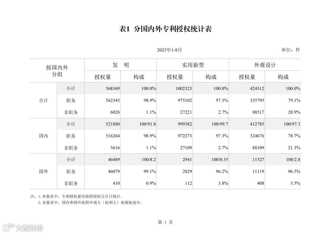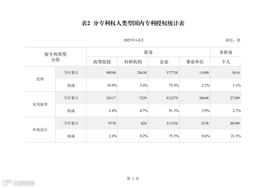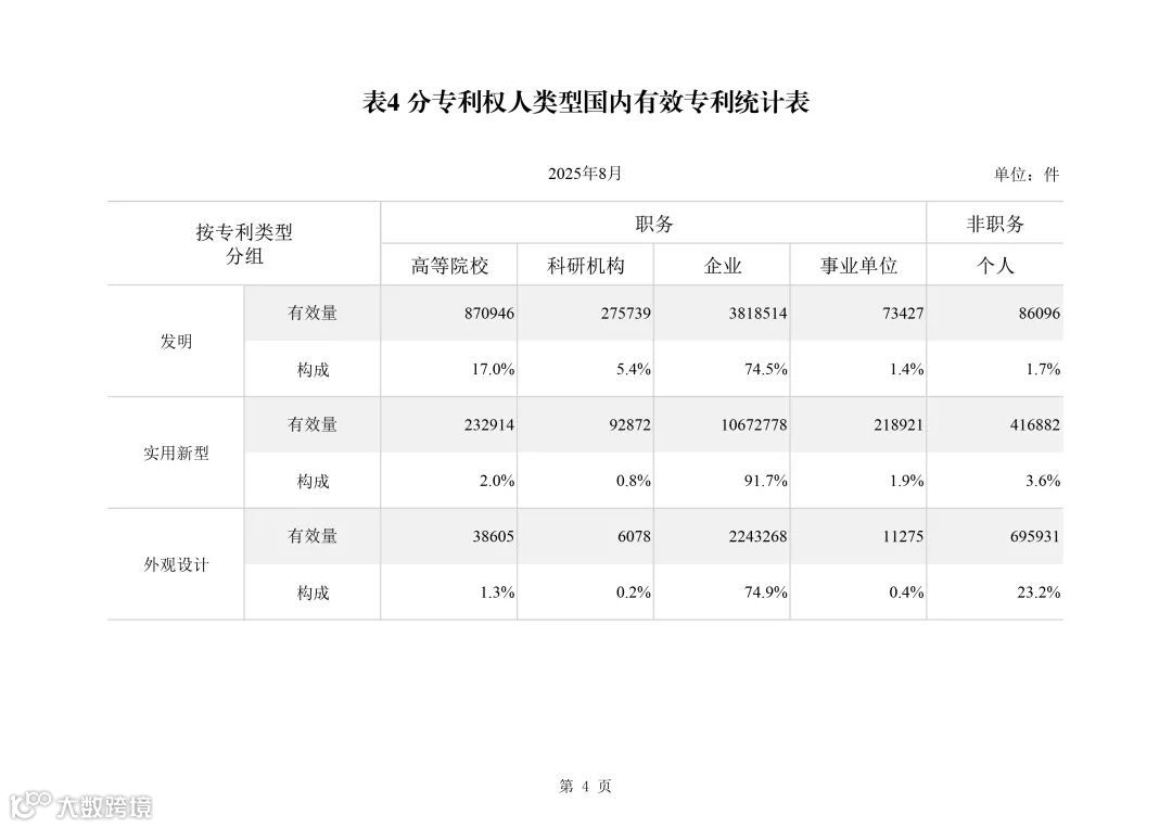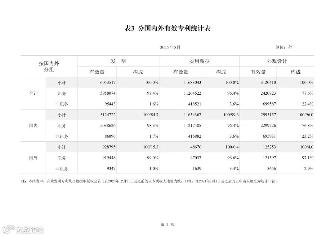 截至2025年8月,三类专利总有效量达2085.697万件。