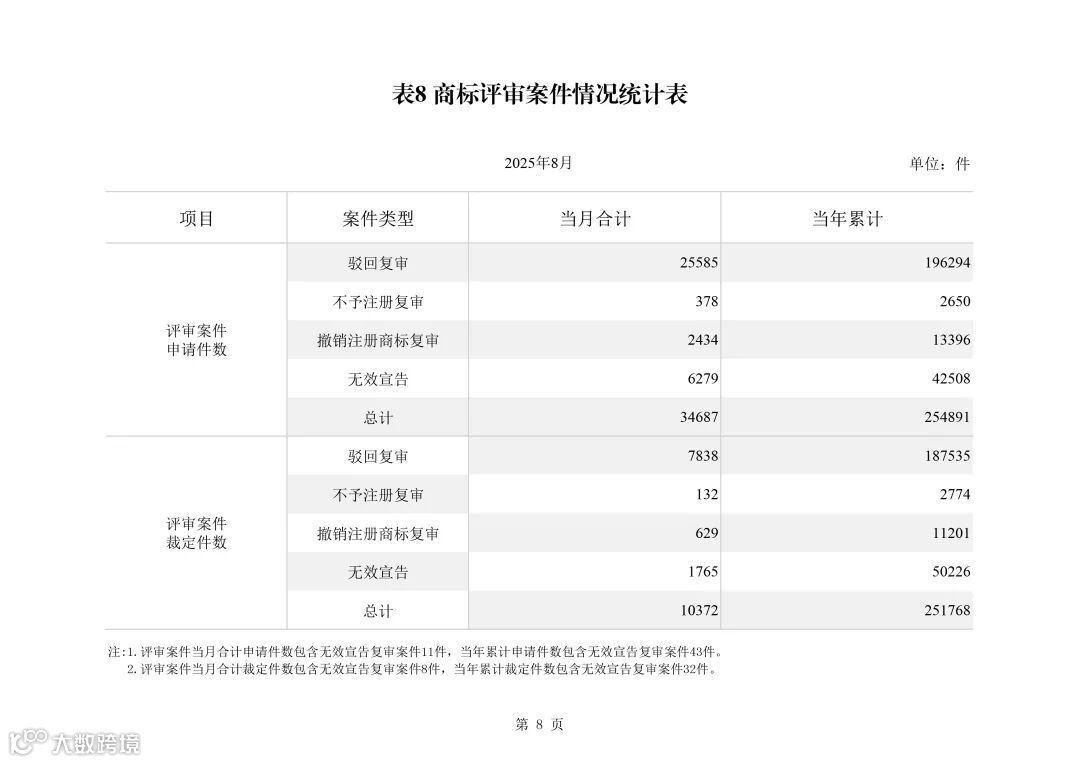 1-8月商标注册量约为285万件,相比2024年同期减少31.8016万件(同比下降10.04%)。申请无效宣告同比下降10.04%,申请驳回复审同比下降11.88%,申请撤销注册商标复审同比上升9.55%。