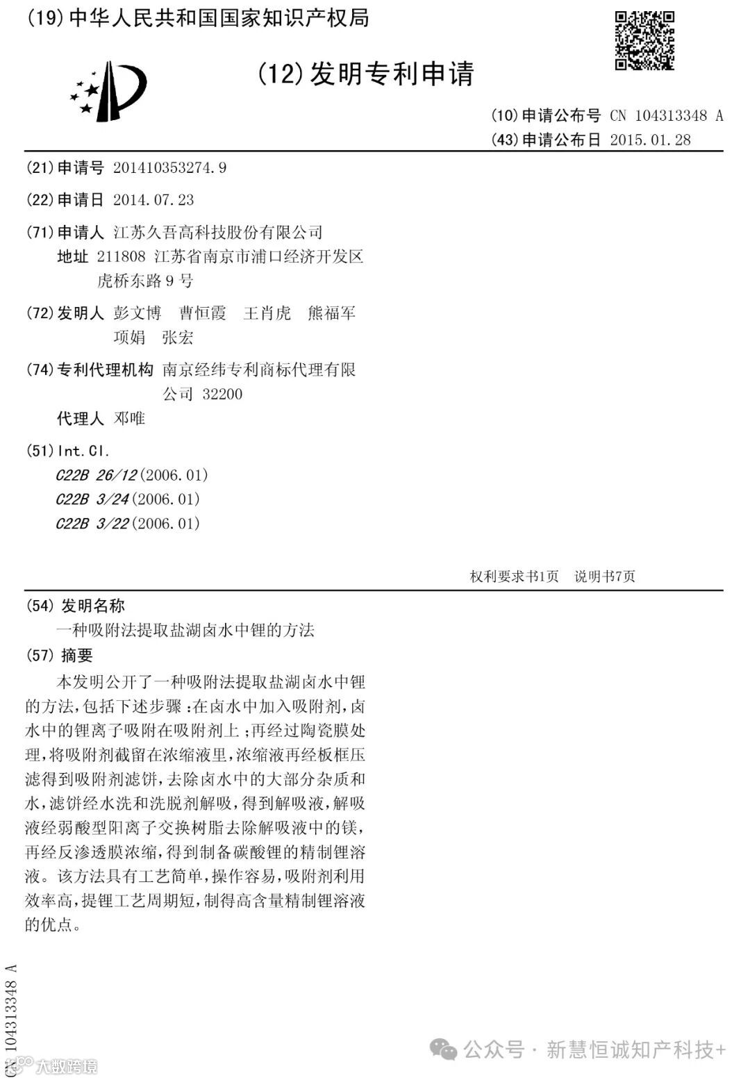 此专利公开了一种吸附法提取盐湖卤水中锂的方法,具有工艺简单,操作容易,吸附剂利用效率高,提锂工艺周期短,制得高含量精制锂溶液的优点。久吾高科锂吸附剂能够显著提升吸附效率,缩短提锂周期,提升终端锂产品纯度。同时,它还确保装置稳定运行,降低生产成本,提高产能,并有效延长后段膜的使用寿命。