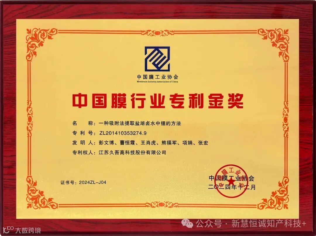 近日,我们非常荣幸地得知,中国膜工业协会第六届常务理事会第六次会议在南京召开,膜工业协会秘书长王继文做工作报告并颁发了2024年度“膜行业专利奖”。江苏久吾高科技股份有限公司“一种吸附法提取盐湖卤水中锂的方法”(专利号:ZL201410353274.9)获得“中国膜行业专利金奖”,此次获奖标志着久吾高科在盐湖提锂技术领域的领先地位和行业认可。