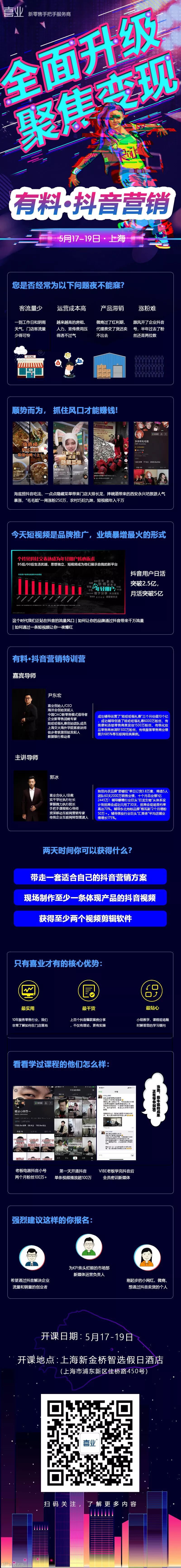 这次课程还更新迭代了百分之四十的运营内容,绝对干货满满,如果你对抖音感兴趣,你想学习抖音,你想要在抖音上吸粉,增加品牌曝光,5月17号,我在上海等你!