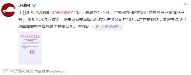 今日,叶挺纪念园拒收“暴走漫画”10万元捐赠款。广东省惠州市惠阳区慈善总会发布情况说明叶挺纪念园不接受一笔来自西安摩摩信息技术有限公司的10万元定向捐赠款,该笔捐款现已退回西安摩摩信息技术有限公司。“暴走漫画”发布的一段短视频中,含有戏谑侮辱董存瑞烈士和叶挺烈士内容,叶挺将军家人已起诉,法院已立案。