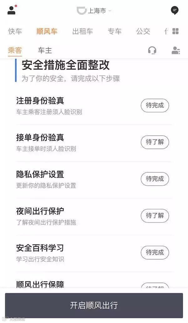 5月19日零时,停业整改一周的滴滴顺风车悄然恢复业务。对于车主的资质审核则要通过6项检测才能正式启用顺风车业务,其中包括注册身份验真、接单身份验真、隐私保护设置、夜间出行保护、安全百科学习、顺风出行保障。