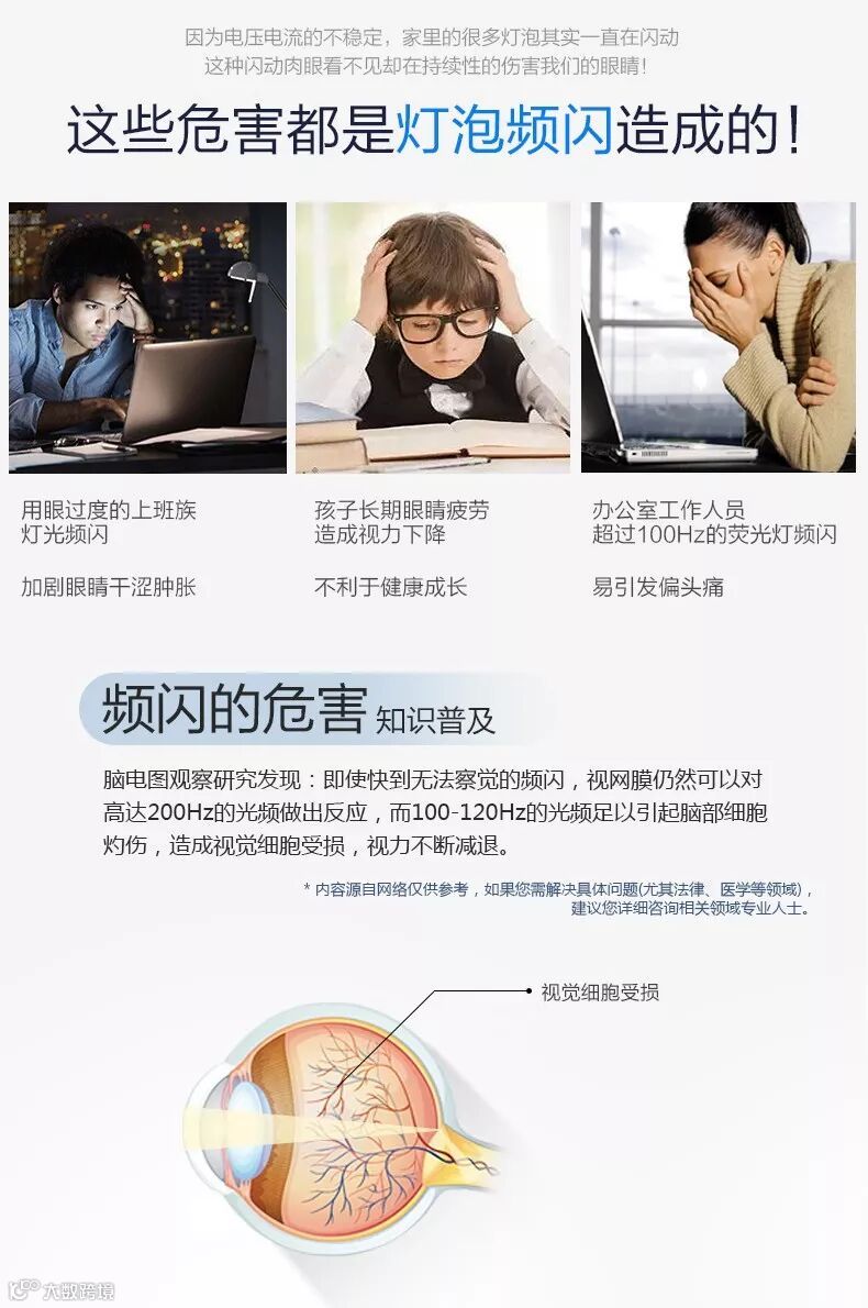 市面上大多数产品为节省灯珠,追求光效,增加蓝光强度并使用无扩散隔离涂层灯罩,使用偏蓝白色灯罩,导致发光偏蓝白和泛青色,蓝光光照长期使用会构成对人体肉眼伤害,出现眼花晕眩的感觉。
