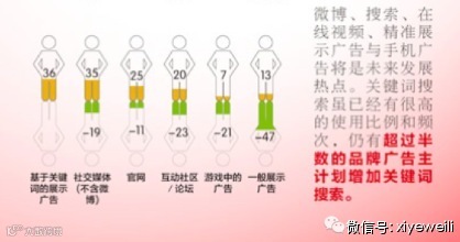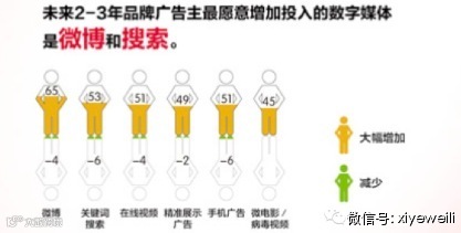 微信、微博、搜索、在线视频、精确展示广告和手机广告将是未来发展的热点。关键词搜索虽然已经有很高的使用比例和频次,仍有超过半数的品牌广告主计划增加关键词搜索。