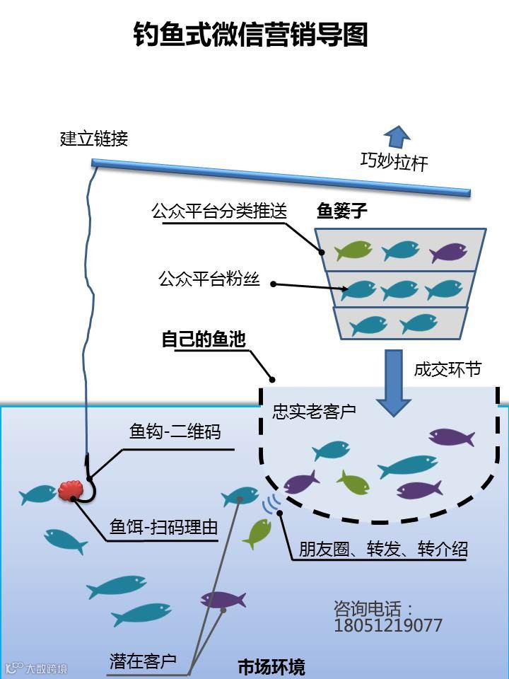“钓鱼式微营销导图”是掌握微力商学院基础课程《微信营销特训营》的核心内容,由原“偷菜”游戏制作人金菲老师主讲。钓鱼理论的核心是“建立链接”,如何建立?就需要用到超级诱饵。超级诱饵、扫码理由、扫码指令能有效保证扫码量,让你的微营销有一个好的起步。前期聚集大量精准粉丝是微营销后期变现和引爆的保证。