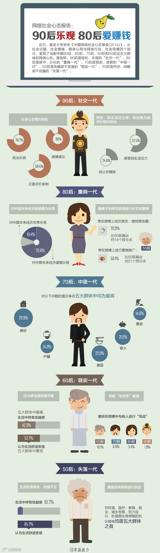 近日,复旦大学发布《中国网络社会心态报告(2014)》,呈现了当前中国90后、80后、70后、60后和50后这五大群体的网络心态。