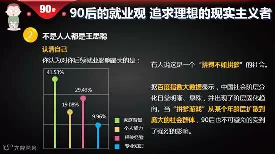 “叛逆”、“追星”、“性开放”、“拜金”等词语频频被媒体和公众用在90后群体身上,不过百度《90后洞察报告》却颠覆了人们对90后的普遍认知:9成以上90后认为父母比另一半更重要,7成以上有处女/男情节。而对于消费,90后的选择也颇为理性,他们更愿意为自己喜欢的事物而买单,更在意商品的质量而非是否名牌。