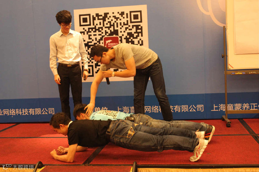 会务监督赵龙老师上台示范平板支撑,遭来自吴江蜂球丝绸、身为健身教练的康海东同学纠正姿势