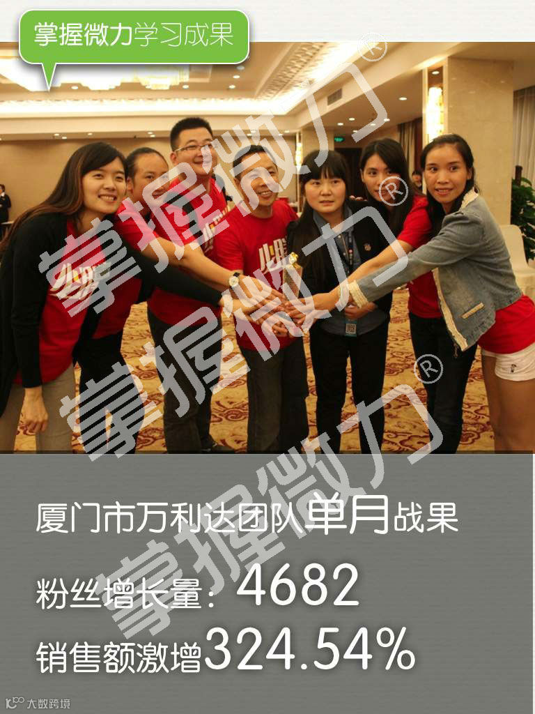 2013年经常听到朋友说起微信营销,我开始注意这件事。朋友圈当中也陆陆续续看到一些成功案例。我对微信营销兴趣越来越浓。后来接触到金菲老师的“掌握微力”课程。前段时间带着几个人的团队听了一天的课程介绍,马上激发了我对微信营销的探索欲。当场我就报名了八个名额。第14期“掌握微力”我派了我们导购过来学习了之后,回来稍有成效。这次我带着团队参加第15期微信课程。这让我明白,一定要带着团队来听才能落地微营销。这次学习对我触动最大的就是客户分类这块。非常感谢金菲老师和“掌握微力”团队,这样的课程真的是我们传统企业的推助器,能迅速帮助到大家!