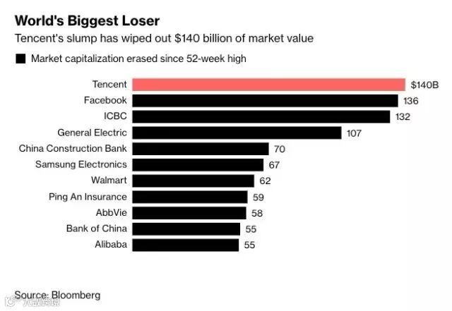 据彭博社报道,腾讯控股公司的股价已经较今年1月份时的最高点下跌了25%,市值蒸发了大约1400亿美元。从每只股票创下52周最高点的日期算起,腾讯股东失去的财富在全球最多。Facebook紧随其后,其市值在过去三个交易日累计蒸发了1360亿美元。全球投资者开始怀疑,科技股的最好时光是否已经结束。