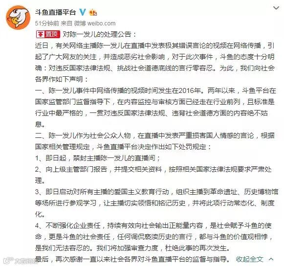 昨日晚间斗鱼公告称:有关网络主播陈一发儿在直播中发表极其错误言论的视频在网络传播,引起了广大网友的关注,并造成恶劣社会影响。即日起,禁封主播陈一发儿的直播间,启动对所有主播的爱国主义教育行动,组织主播到革命遗址、历史博物馆等场所进行参观学习,让主播切实领悟和铭记历史,并将此项行动常态化、制度化。