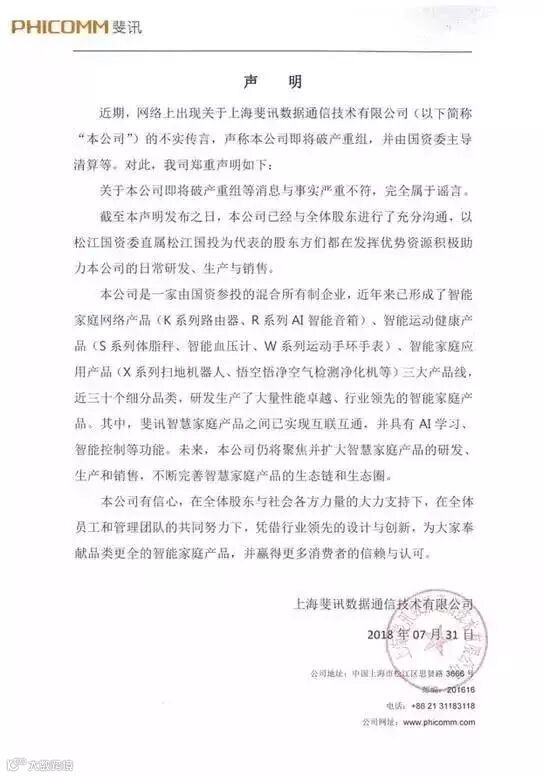 斐讯官网发布声明称:关于本公司即将破产重组等消息与事实严重不符,完全属于谣言;本公司已经与全体股东进行了充分沟通,以松江国资委直属松江国投为代表的股东方们都在发挥优势资源积极助力本公司的日常研发、生产与销售。