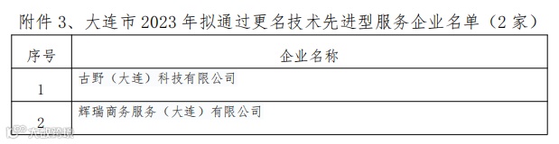 根据财政部、国家税务总局、商务部、科技部、国家发展改革委联合下发的《关于将技术先进型服务企业有关企业所得税政策推广至全国实施的通知》(财税[2017]79号)、《关于将服务贸易创新发展试点地区技术先进型服务企业所得税政策推广至全国实施的通知》(财税〔2018〕44号)和《大连市技术先进型服务企业认定管理办法(修订)》(大科高发[2018]151号)文件精神,经企业自主申报、区(市)县相关部门形式审查、市科技局会同市商务局、市财政局、市税务局和市发展改革委评审认定,确定大连市2023年拟认定技术先进型服务企业8家、拟通过复审技术先进型服务企业3家,拟更名技术先进型服务企业2家,现予以公示(名单附后)。