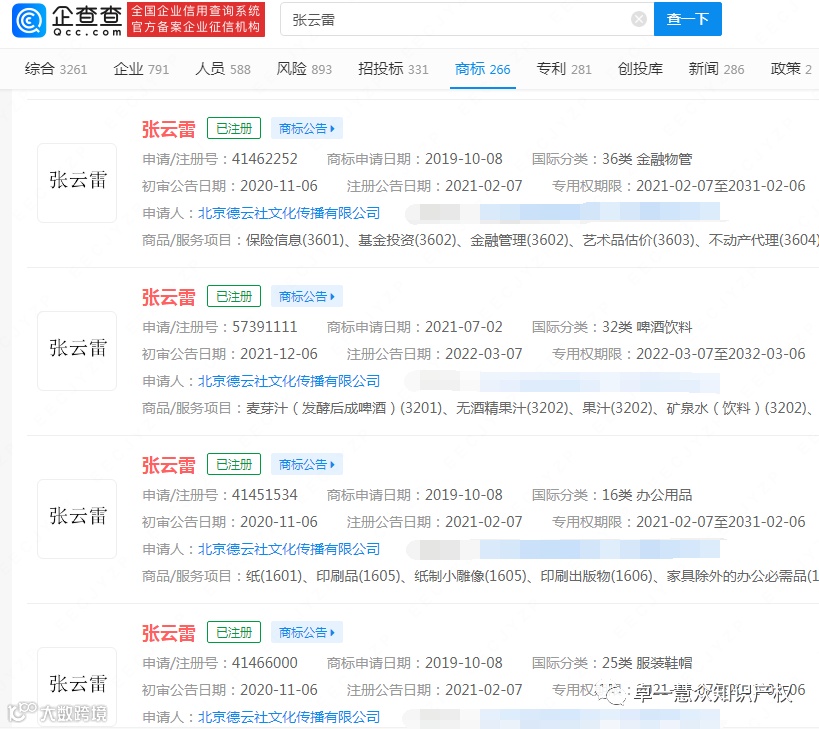 查询企查查发现,北京德云社文化传播有限公司已注册多个“张云雷”相关商标,国际分类包括:金融物管、啤酒饮料、办公用品、服装鞋帽、医疗器械、珠宝钟表等。
