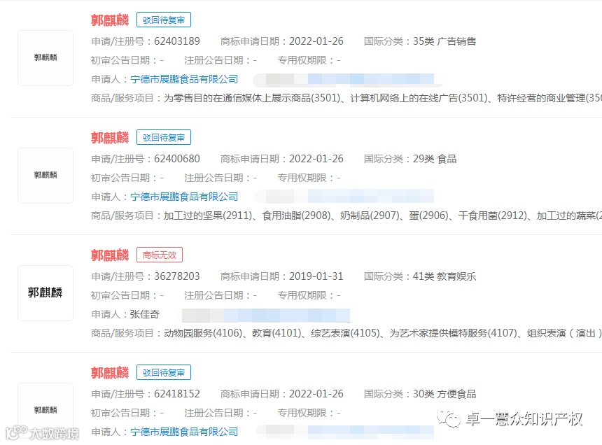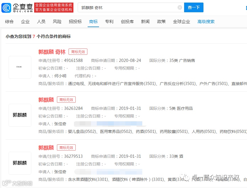 7个“郭麒麟”商标,没有一个是德云社申请的。好在他人热度也没有蹭上,因为这些商标不是被驳回就是已经无效了!