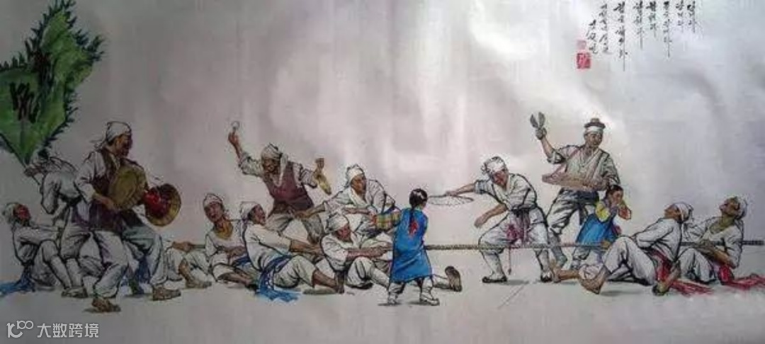 “牵钩”是古称,其实就是现代的拔河运动。据说春秋时,楚国为了进攻吴国,以牵钩这种运动来增强人民的体质。它主要是以一根麻绳,两头分为许多小绳,比赛时,以一面大旗为界,一声令下,双方各自用力拉绳,鼓乐齐鸣,双方助威呐喊,热闹非凡。
