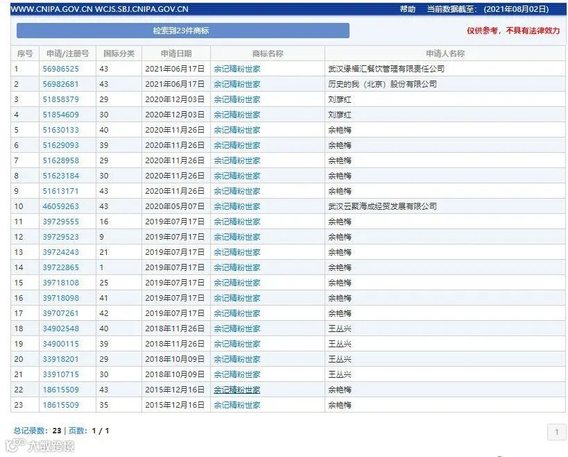 2018年11月,武汉市江汉区人民法院依法判决:王某将“余记精粉世家”商标由原告余艳梅名下转让至其名下的行为无效;