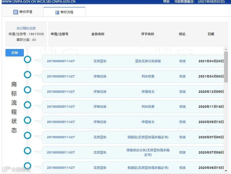 然而,2019年4月,武汉某渔业有限公司向国家知识产权局提出申请,以“余记精粉世家”与其持有的“精粉世家”商标相同或相似为由,申请宣告“余记精粉世家”无效。2020年7月,国家知识产权局裁定“余记精粉世家”商标予以无效宣告。因种种原因,余艳梅在评审阶段规定期限内未予答辩,遂起诉并上诉至北京市高级人民法院,请求重新作出裁定。2021年3月,北京市高级人民法院驳回其上诉,维持原判。7月26日,余艳梅不得不含泪摘下门口使用了13年的“精粉世家”招牌,换上“余艳梅拌面世家”。