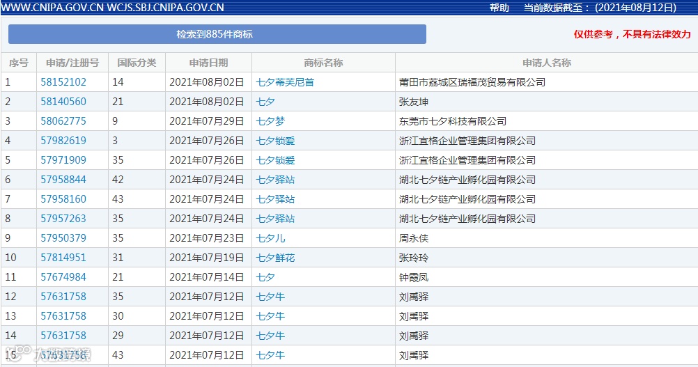 在商标局查询“七夕”商标,相关记录有885条记录,涉及各个类别,主要集中在服装鞋帽(25类)、广告贸易(35类)、教育娱乐(41类)等类别,商标样式也是丰富多彩。