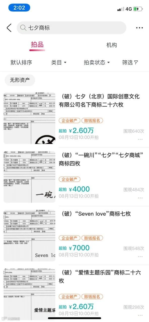 第四类为“一碗川”“七夕”“七夕商城”文字商标4枚。其中,“一碗川”核定使用在备办宴席、咖啡馆、餐厅、会议室出租、养老院、桌子、动物寄养等方面,“七夕”核定使用在娱乐服务、现场表演、书籍出版、综艺表演等方面,“七夕商城”商标为2个,核定使用在货物展出、广告宣传、样品散发、替他人推销、市场营销、计算机网络上的在线广告、为广告宣传目的组织时装表演等方面。4枚商标使用期限至2026年8月到2027年6月不等,起拍价为4000元,保证金为800元,加价幅度为80元。