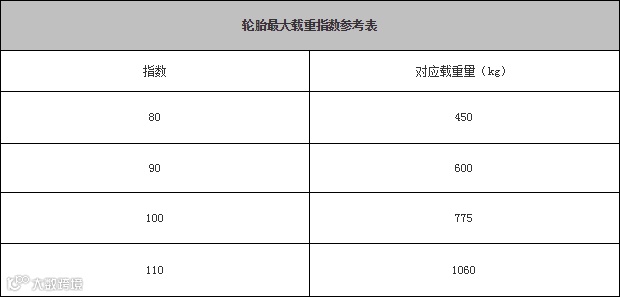 载重系数代表着轮胎最大能承受的重量,小编在唠叨一句,安全行驶不要超载。例如上图中轮胎载重系统91,对照表格,对于的载重系数为600多KG,四个轮子乘以四,我们可以得带车子载重是2.4吨左右。