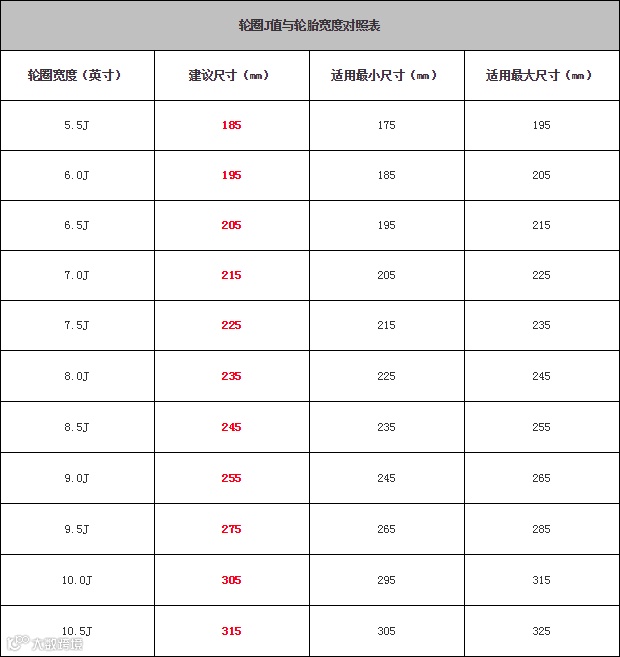 轮毂的J值有一个对应的表格,例如上图写着16x61/2J(16x6.5J),对照表格,轮毂的宽度选择范围(195-215),选择205为最佳!