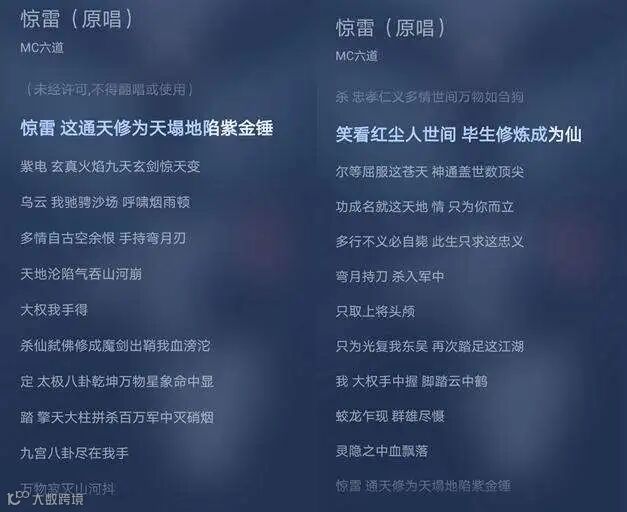 在一次网络直播中,针对网友关于《惊雷》的提问,知名歌手杨坤称该歌曲没有节奏、没有律动、没有技术含量。更有网友提出,《惊雷》涉嫌抄袭歌曲《姑娘跟我走DJ》的伴奏,并列出多个佐证。对此,《惊雷》创作者“MC六道”予以否认。