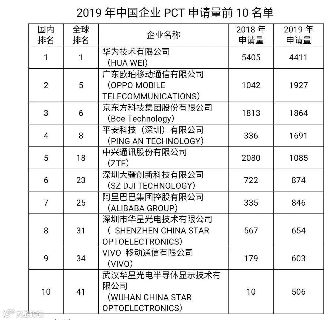以上各数据基于WIPO发布2019年PCT数据,由中国专利保护协会整理。