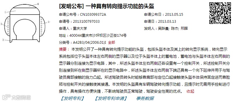 该项专利的主要作用是给予后车转向提示,头盔分别在左右两侧加入控制开关、定位凸起,在需要转向时,可以通过驾驶员的转头,自动实现定位凸起、肩部的接触,与控制开头联通,发出转向的显示和提示。此专项,可以实现自动控制和转向提示,无需手动操作,不影响正常驾驶。