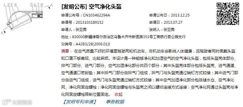 该项专利技术主要作用是净化和加湿空气,头盔由壳体、排气、进气、加湿净化四个部分组成,穿戴者,吸气时,可以让空气经过净化过滤、加湿后的,进入人体,呼气时,通过排气部分排出头盔,保持头盔内部空气的质量。此专利在疫情期间,可以让穿戴者省去戴口罩的麻烦,发挥更大作用。