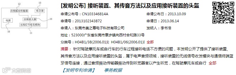 该项专利的主要作用是让穿戴者不停车接听电话,头盔增加了接听装置及收发模块、音频振动传输器等装备,来电话时,利用无线信号的收发模块与通信终端进行蓝牙连接,再通过音频振动传输器传输给穿戴者以产生听觉。此专利,可以实现穿戴者不停车接听电话,免去戴耳机的麻烦。