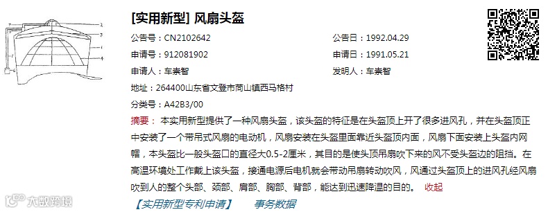 该项专利的主要作用就是降温,头盔在顶部开设了进风孔,并加装了吊式风扇,接通电源后,可以通过电机的带动,利用风扇把风吹到头、颈、肩、背等部位,从而,迅速降温,是夏季必备的产品。而且,此专利还加入可拆卸的设计,取下降温部件,一年四季皆可使用。