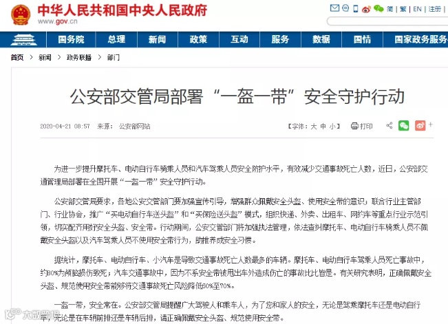 原来近日头盔突然火爆,起源于公安部的通知。公安部通知,自2020年6月1日起,将在全国开展“一盔一带”安全守护行动。