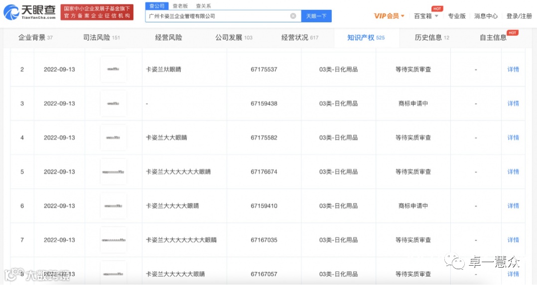 近日,广州卡姿兰企业管理有限公司申请注册“卡姿兰夶眼睛”“卡姿兰大大眼睛”“卡姿兰大大大眼睛”“卡姿兰大大大大眼睛”“卡姿兰大大大大大眼睛”“卡姿兰大大大大大大眼睛”“卡姿兰大大大大大大大眼睛”商标,国际分类为日化用品,当前商标状态多为等待实质审查。