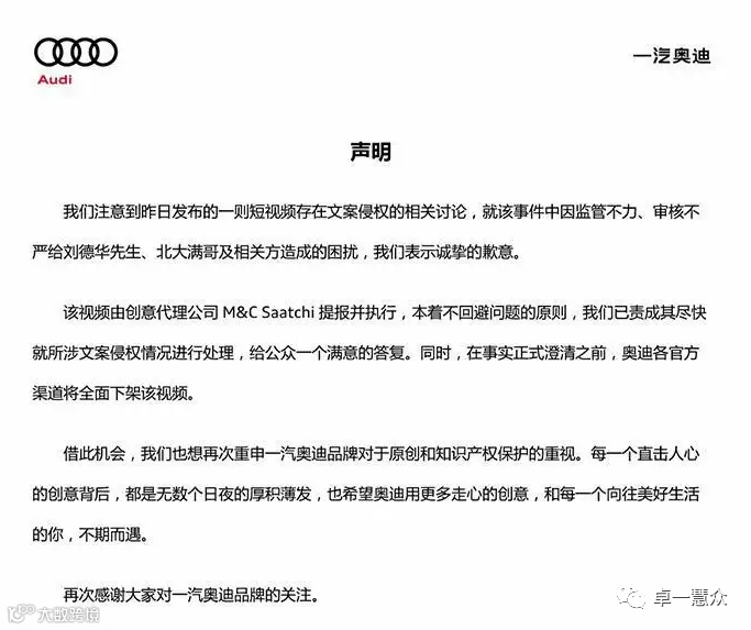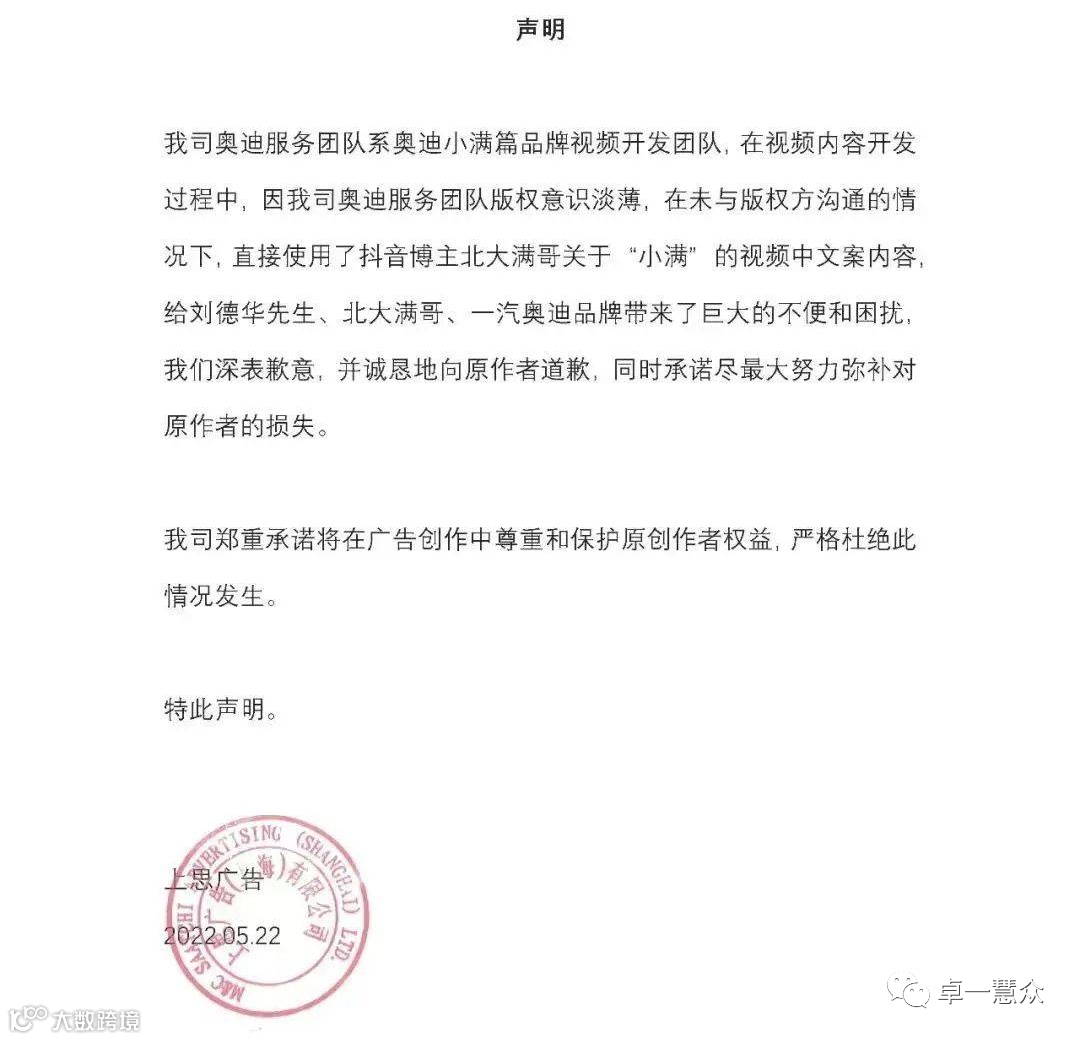 针对“奥迪小满广告抄袭”,上思广告也发布声明: