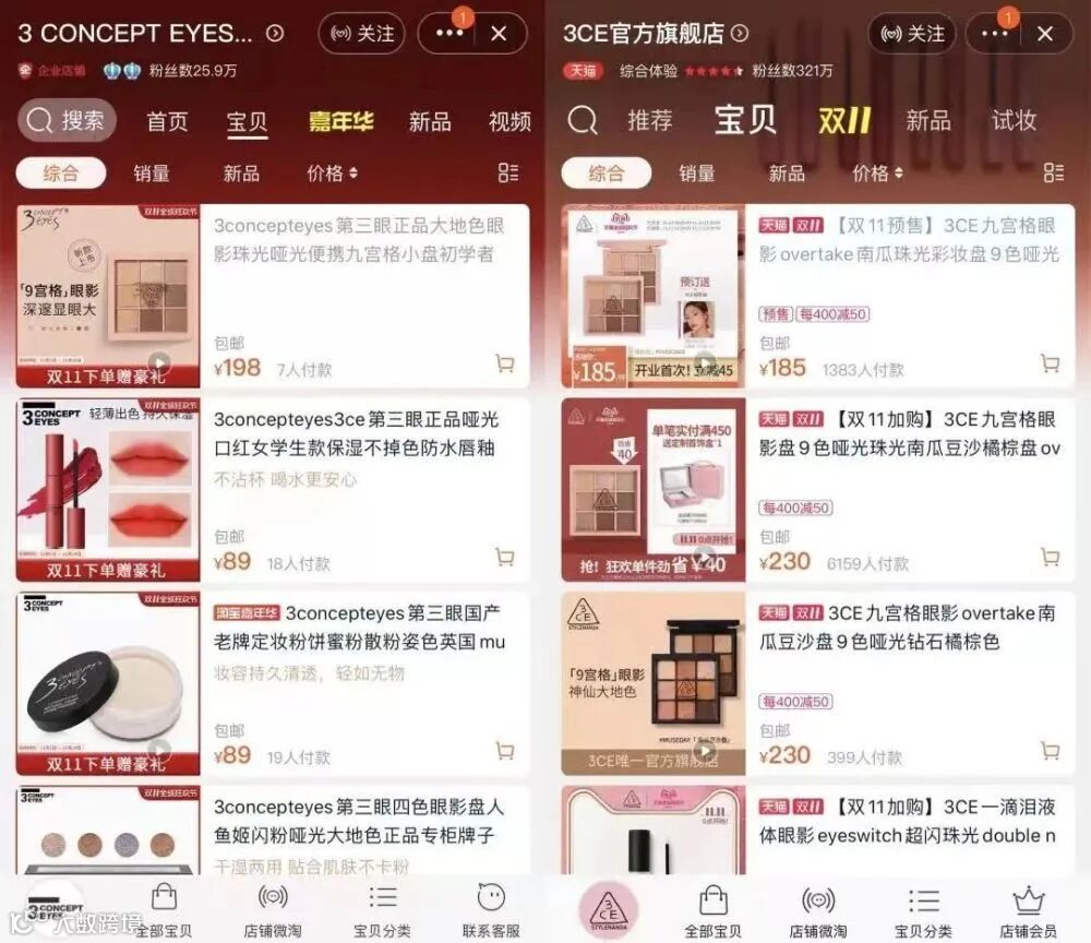 (左为3 CONCEPT EYES旗舰店,右为3CE旗舰店)