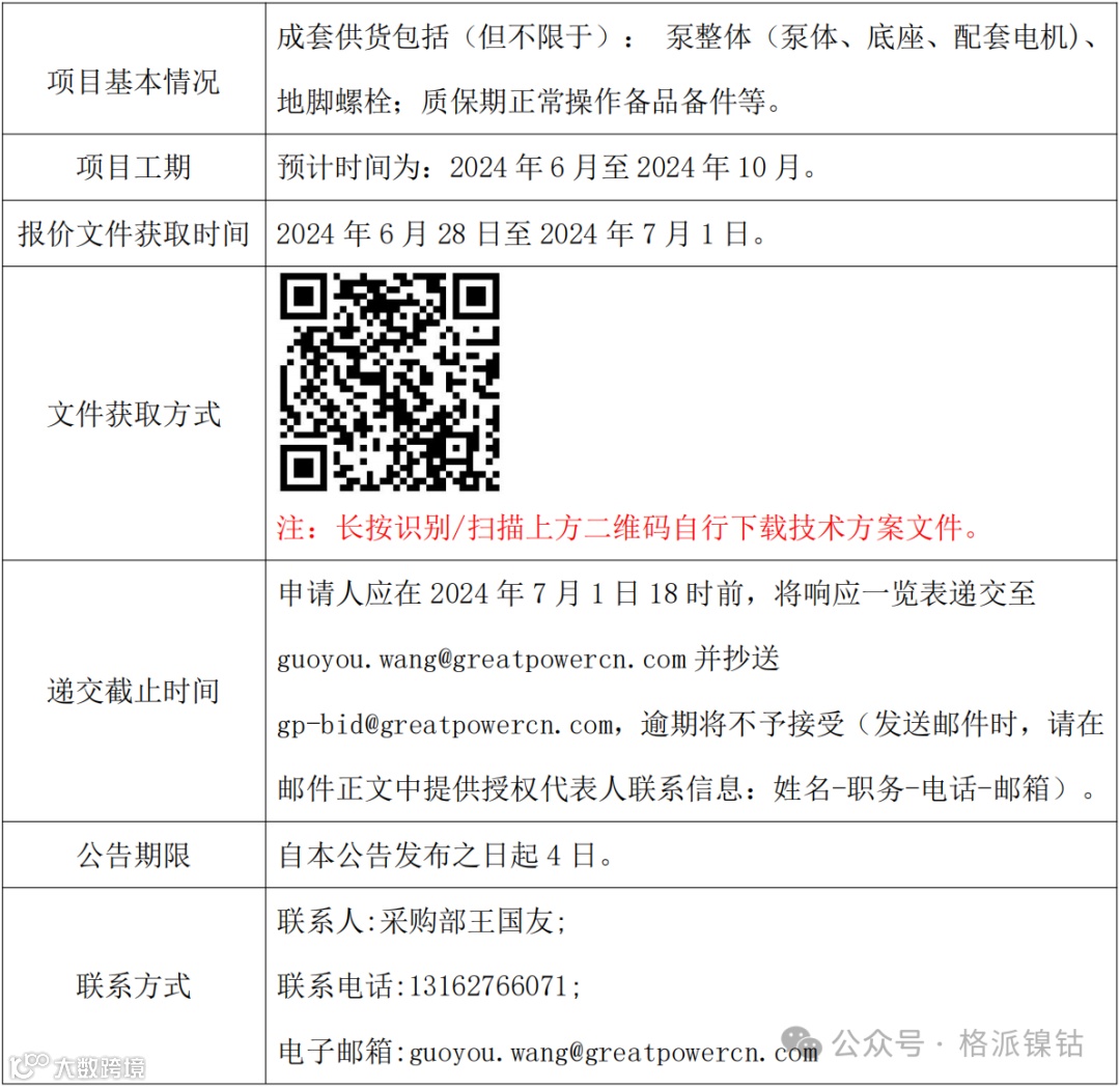【格派招标延期公告、询比价、预告】烤包器设备、合金泵等项目