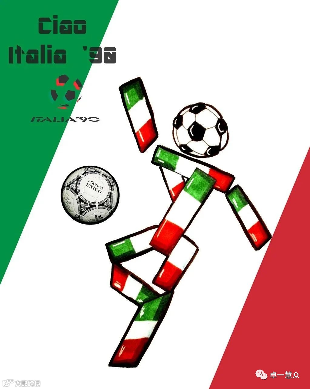 1990年,意大利世界杯吉祥物“查奥”则显得比较抽象,它是一个以绿、白、红三色(意大利国旗色)积木和足球组成的人偶。