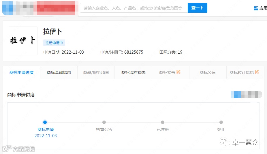 果不其然,网上信息显示,"拉伊卜"商标在11月初被自然人王某某申请注册,相关注册申请的国际分类为19类建筑材料,申请/注册号为68125875,商标类型为普通商标,目前商标状态显示为"注册申请中"。