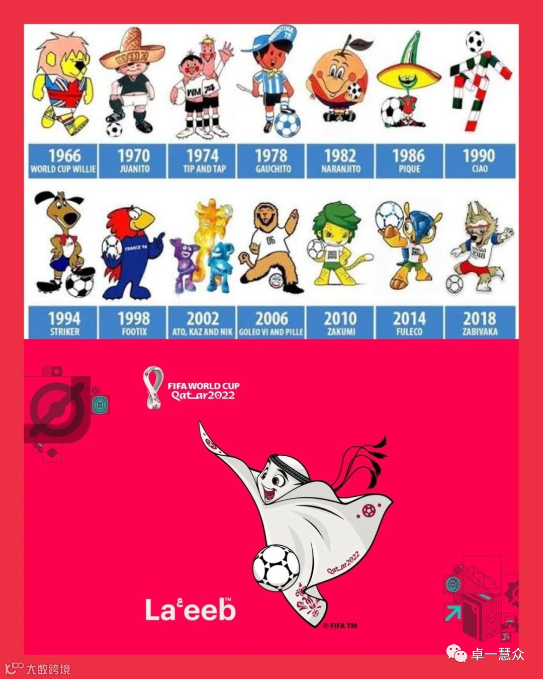 这与世界杯吉祥物的视觉变化也是相似的,拉伊卜使用抽象元素,更多地使用3D模型展示,也是时代精神与创新精神的体现。