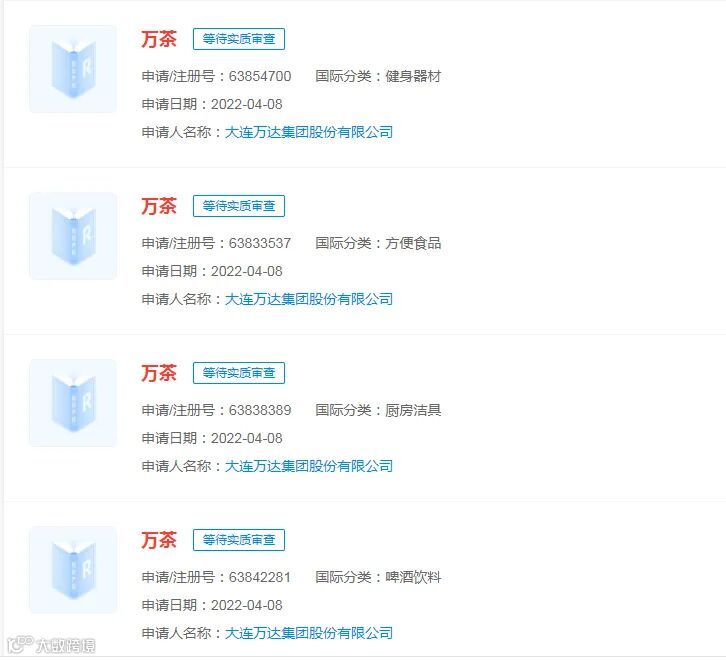 天眼查显示,近日,大连万达集团股份有限公司申请注册多个“万茶”商标,国际分类包括啤酒饮料、方便食品、厨房洁具等,目前商标状态均为等待实质审查。
