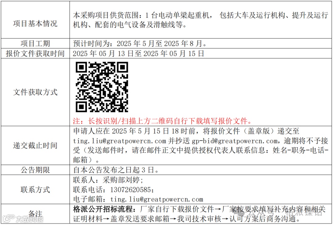 【招标公告、询比价公告】精密过滤器和电动单梁起重机设备