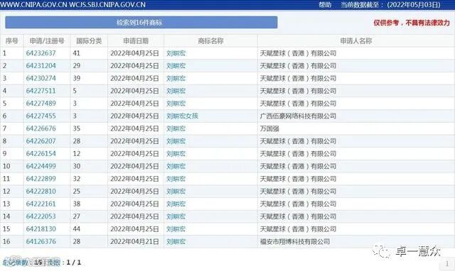 据中国商标网资料显示,“刘畊宏”商标已被注册15件,注册人分别为香港某公司、福安某公司及自然人万某,而“刘畊宏女孩”也已被抢注广西某公司抢注。此外,“刘耕宏”也被上述其中两位申请人申请注册。
