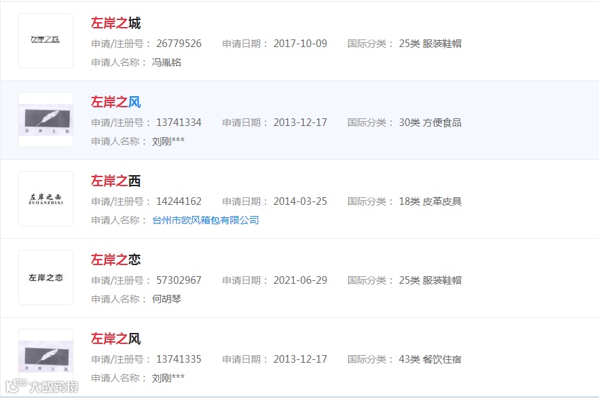 据相关商标查询网站显示,查询“左岸之家”商标,已注册成功的近似商标可并不少:“左岸之华”、“左岸之城”、“左岸之西”、“左岸之风”……此外,2020年7月,一件名为“左岸之家”的商标被东营某电子商务有限公司提交了商标注册申请,时间比江歌妈妈申请“左岸之家”商标的时间早了将近一年。