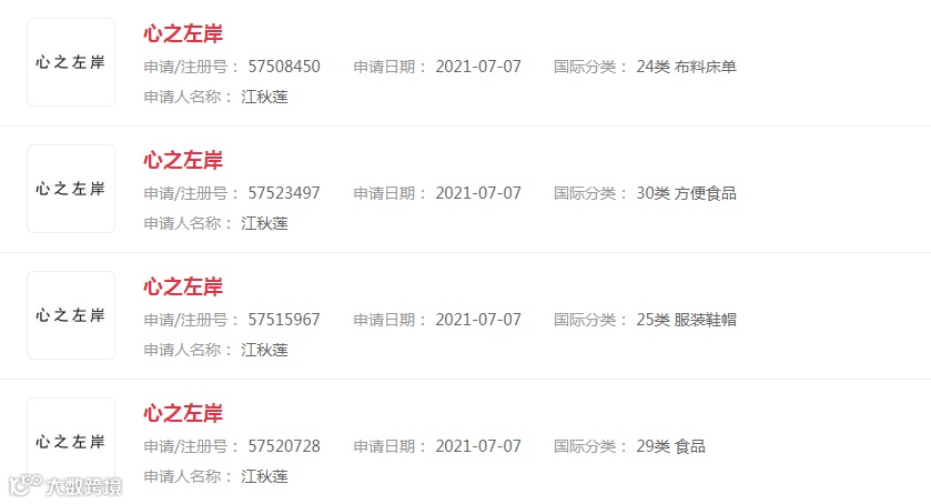 据查询发现,江歌妈妈注册的数件商标皆与女儿江歌有关,“左岸”为江歌的网名,而江歌妈妈注册的这两件商标名称为“左岸之家”及“心之左岸”,很明显都是在纪念自己的女儿江歌。