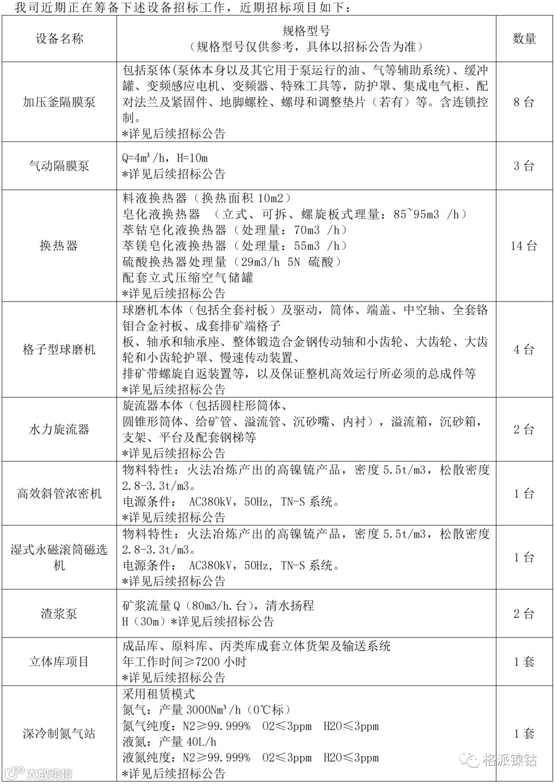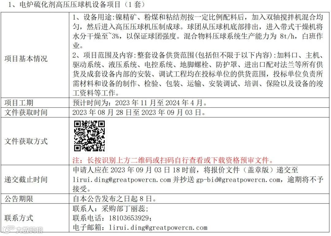 原文链接:【格派招标公告、预告及延期公告】重型圆盘给料机和电炉硫化剂高压压球机设备等设备