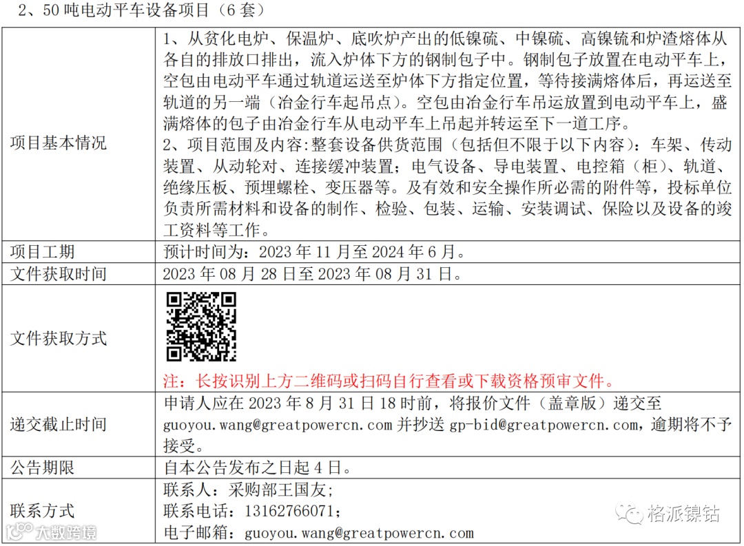 我司发布的“电炉硫化剂高压压球机设备项目、50吨电动平车设备项目 (招标编号: GPGR-SOR-PA-202308-02-V01、GPGR-SOR-PA-202308-13-V01) 招标公告”因有效投标人数不能满足开标要求以及时间安排,故招标时间进行延期,调整如下